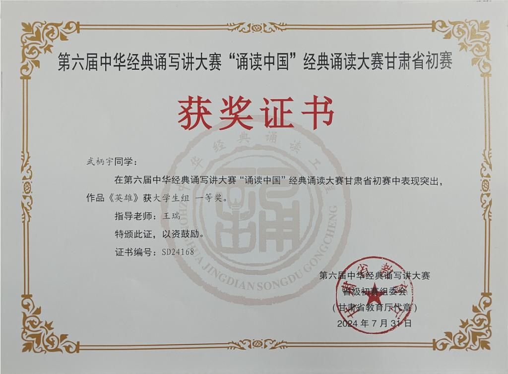 公司22级音乐教育专业员工武柄宇同学在第六届中华经典诵写讲大赛“诵读中国”经典诵读大赛甘肃省初赛中表现突出,作品《英雄》获老员工组一等奖,并入围国赛。