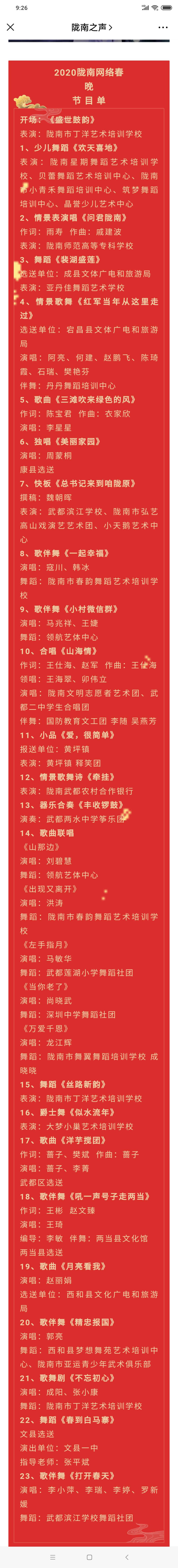 梦圆新时代,幸福新陇南。由中共陇南市委宣传部、陇南市文化广电和旅游局主办,陇南广播电视台承办,各县区委宣传部、文体广旅局、融媒体中心协办的2020年陇南网络春节联欢晚会2020119日在陇南礼堂演出。