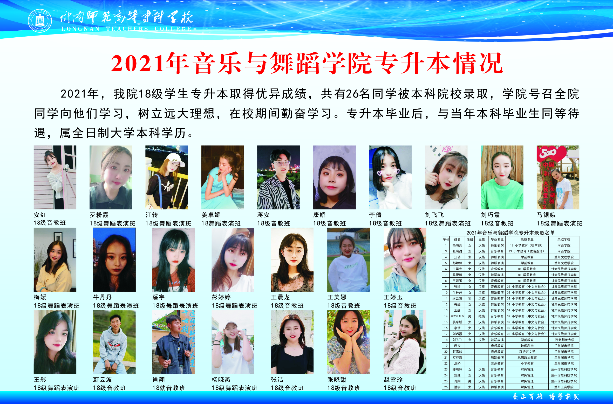 公司2021届共有毕业生143人,其中舞蹈表演专业55人(报考专升本15人,考取10人,报考率27.3%,录取率66.7%),音乐教育专业88人(报考专升本35人,考取12人,报考率39.8%,录取率34.3%)。第二次报考4人(音乐教育专业3人,舞蹈表演专业1人),录取4人。